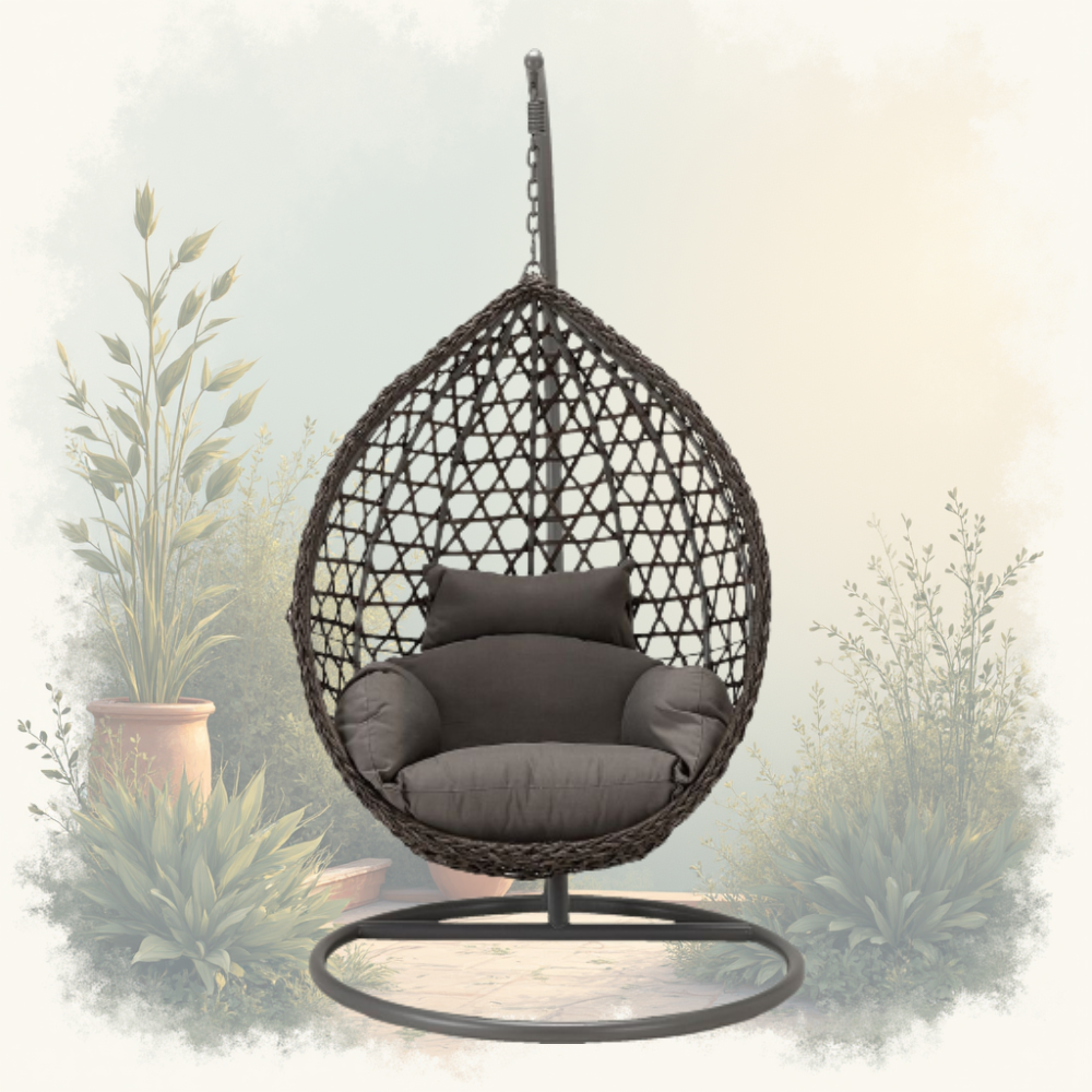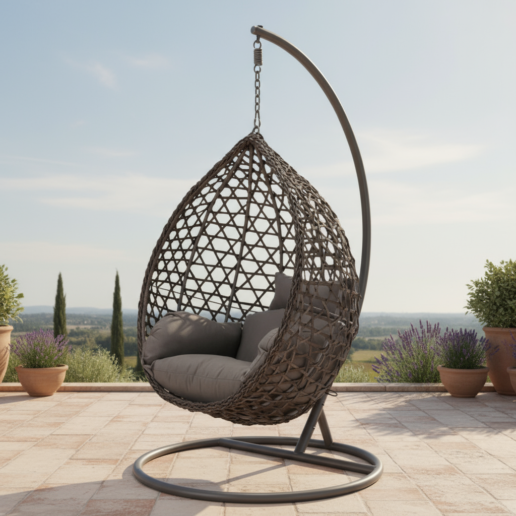 Der Fleurdelys Hängesessel vereint ikonisches Design mit tiefenentspannendem Komfort. Eingebettet in die elegante, ei-förmige Sitzschale und umhüllt von weichen Kissen in Taupe, finden Sie hier die perfekte Oase zum Abschalten – ob im Wohnbereich oder unter freiem Himmel.