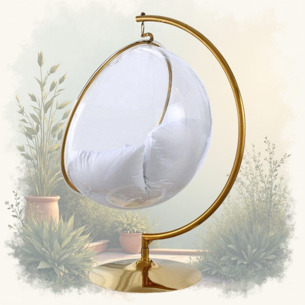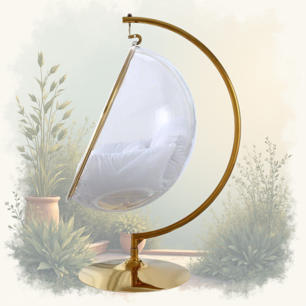 Präsentieren Sie den Vendôme Hängesessel – ein ikonisches Vintage-Stück aus unserer limitierten Kollektion. Das transparente Design auf eleganter goldfarbener Basis verleiht Ihrem Wohnbereich einen einzigartigen Retro-Charme und schafft eine luftig-leichte Atmosphäre.